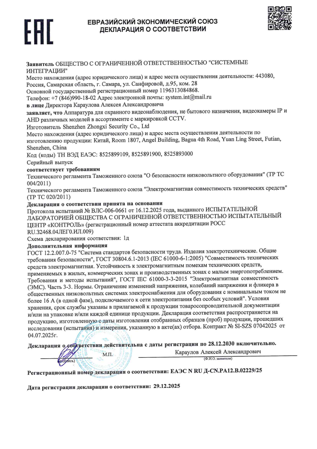 Документ, подтверждающий, что видеокамеры 9 серии соответствуют требованиям, указанным в соответствующих Технических регламентах Таможенного союза.