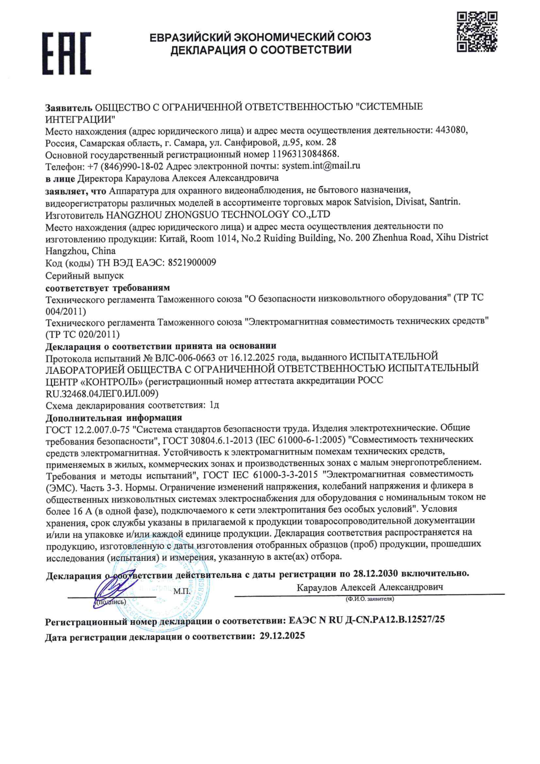 Документ, подтверждающий, что видеодомофоны Satvision соответствуют требованиям, указанным в соответствующих Технических регламентах Таможенного союза.